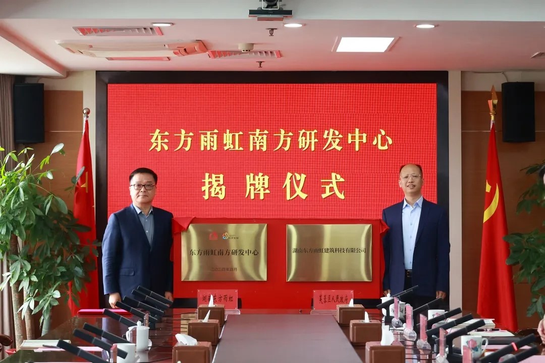 仪式现场,湖南东方雨虹建筑科技有限公司与芙蓉区人生就是博签署合作协议,何绍军、周春晖为“东方雨虹南方研发中心”揭牌。